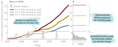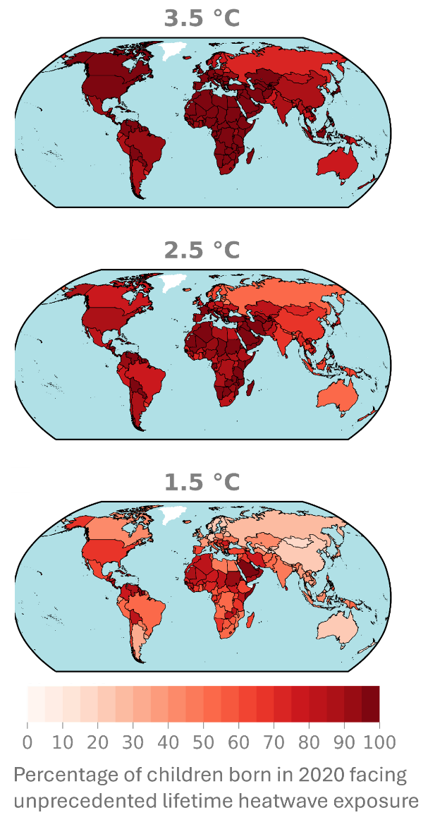 Si les températures mondiales augmentent de 3,5°C d'ici à 2100, 92% des enfants nés en 2020 connaîtront une exposition sans précédent aux vagues de chaleur au cours de leur vie, ce qui concernera 111 millions d'enfants. Le respect de l'objectif de 1,5°C de l'Accord de Paris pourrait protéger 49 millions d'enfants de ce risque. Si l'on prend en compte tous les enfants âgés de 5 à 18 ans aujourd'hui, on arrive à un total de 1,5 milliard d'enfants touchés dans le cadre d'un scénario à 3,5°C, alors que 654 millions d'enfants peuvent être protégés en restant en dessous du seuil de 1,5°C.