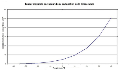 La quantité maximale de vapeur d'eau contenue dans l'air est une fonction de la température (voir graphique ci-dessous). Quand l'atmosphère a atteint le maximum de vapeur d'eau qu'elle peut contenir, on dit qu'elle a atteint son point de saturation (par exemple 9,4 g d'eau par mètre cube à 10 °C). Si on augmente la quantité d'eau dans une atmosphère saturée, il va y avoir un changement d'état de la vapeur d'eau vers un état liquide (condensation) ou vers un état solide (sublimation). Ce sont ces gouttes d'eau ou cristaux de glace qui vont former les nuages.