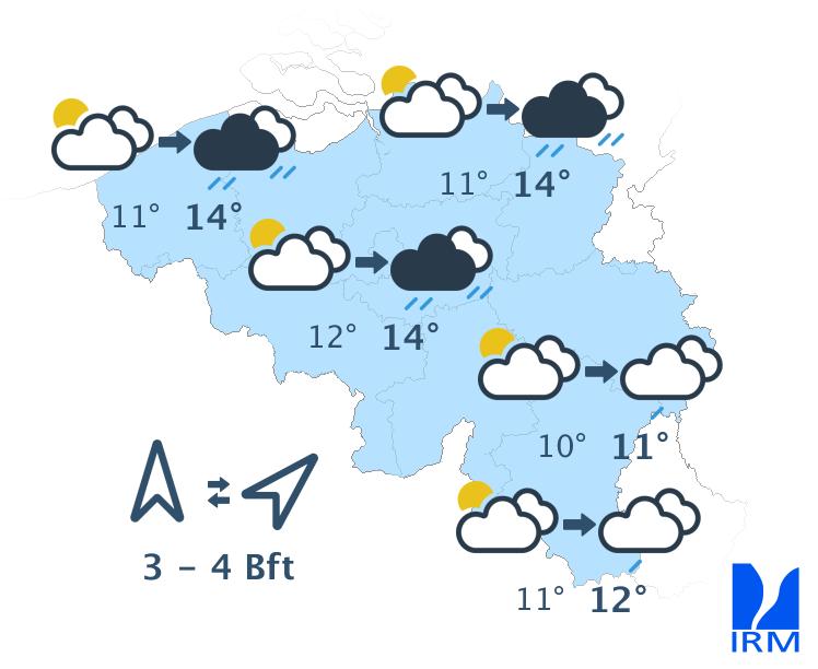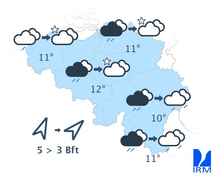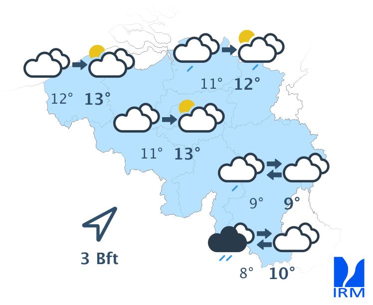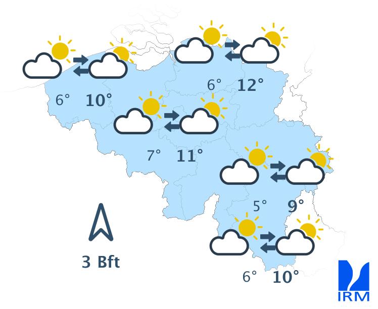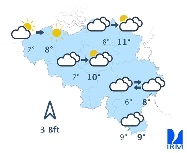 Cet après-midi, le temps sera d'abord encore assez ensoleillé dans la majeure partie des Ardennes, mais la nébulosité augmentera progressivement. Ailleurs, il y aura beaucoup de nuages avec quelques éclaircies. Des averses traverseront le pays d'ouest en est. La plupart des averses se situeront dans la moitié sud du pays. Dans les Ardennes et en Lorraine belge, ces précipitations pourront se transformer en neige fondante et, au-dessus de 500 m, une fine couche de neige d'environ 1 cm pourra se former en certains endroits. Les températures maximales seront de l'ordre de 2 degrés sur les hauteurs ardennaises, 5 à 6 degrés dans le centre et 7 degrés à la mer. Le vent sera généralement modéré de sud-ouest; à la mer, modéré à assez fort d'ouest revenant vers le sud-ouest.