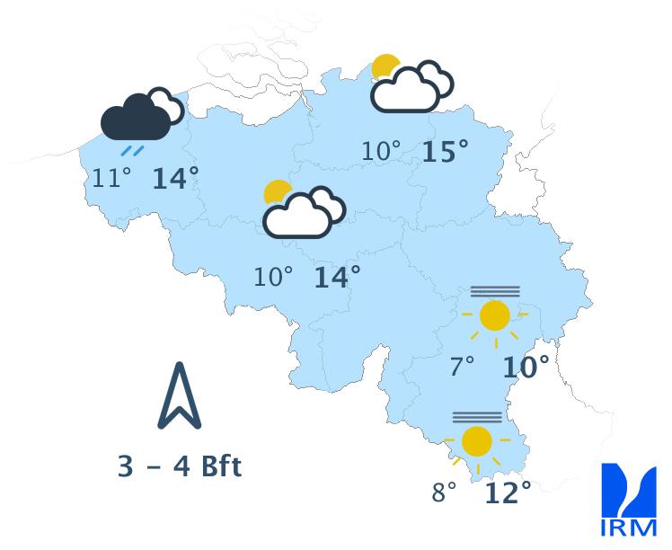 Demain, le temps sera souvent nuageux avec d'abord encore des précipitations hivernales dans les Ardennes. Ensuite, une perturbation accompagnée d'averses traversera le pays depuis la côte. En Basse et Moyenne Belgique, les précipitations tomberont principalement sous forme de pluie, mais il n'est pas exclu qu'une averse donne un peu de grésil ou de neige fondante. Des coups de tonnerre sont également possibles. En Ardenne, la pluie se transformera en neige fondante et en neige. Une couche de neige de 5 à 10 cm pourra se former sur les hauteurs ardennaises (au-dessus de 400 m). Les maxima seront proches de 0 degré sur les hauteurs ardennaises, autour de 6 à 7 degrés dans le centre et de 8 degrés à la mer. Le vent sera modéré de sud-sud-ouest. Au passage de la perturbation, le vent tournera rapidement vers le nord à nord-est. À la mer, la force du vent augmentera alors temporairement pour devenir fort à très fort. Dans le nord-ouest en particulier, ce renforcement du vent pourra entraîner des rafales d'environ 70 km/h et même de l'ordre de 90 km/h à la côte.