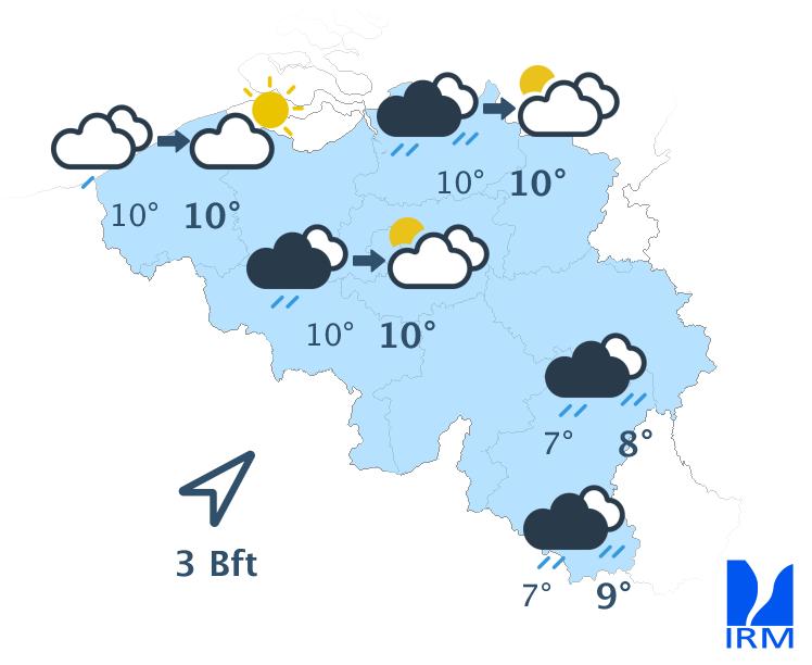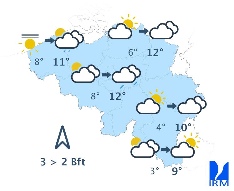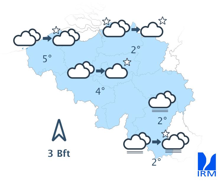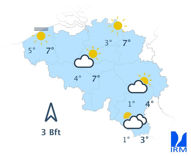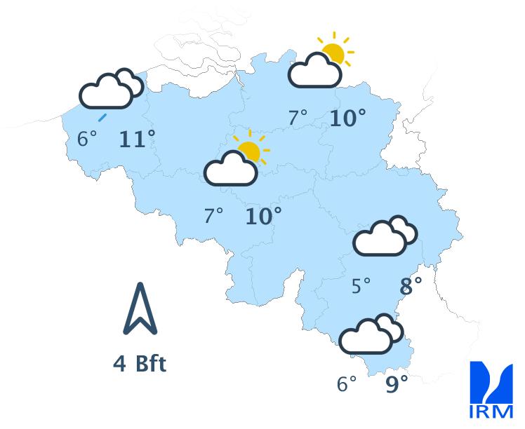 Ce matin, le ciel sera d'abord localement gris avec par endroits de la brume ou du brouillard et la possibilité de quelques fines bruines éparses. Dans le centre et le nord-est du pays, quelques éclaircies seront observées. Au cours de la journée, le brouillard se dissipera et le ciel restera très nuageux dans la plupart des régions. En Ardenne, des éclaircies pourront se former dans l’après-midi, puis s’étendre ensuite vers le nord-est du pays. Les maxima varieront entre 5 degrés en haute Ardenne et 9 degrés sur une grande partie ouest du pays. Le vent de sud sera faible à généralement modéré.