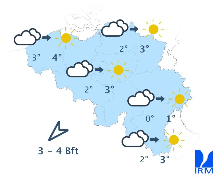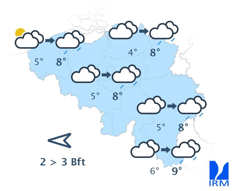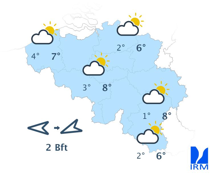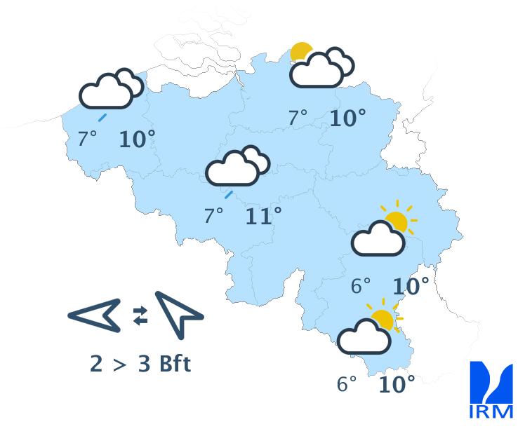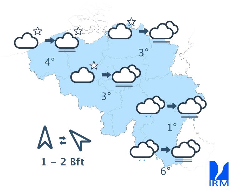Ce soir et en début de nuit, le ciel deviendra peu nuageux en Basse et Moyenne Belgique. En Haute Belgique, il faudra composer avec beaucoup de nuages bas ainsi que de la brume et du brouillard. En seconde partie de nuit, la nébulosité augmentera par le sud avec l'arrivée des premières gouttes en Lorraine Belge en fin de nuit. De la brume et du brouillard pourront également se former par endroits, ailleurs dans le pays. Les minima seront compris entre 2 et 6 degrés, sous un vent le plus souvent faible de secteur sud-est ou de directions variées.