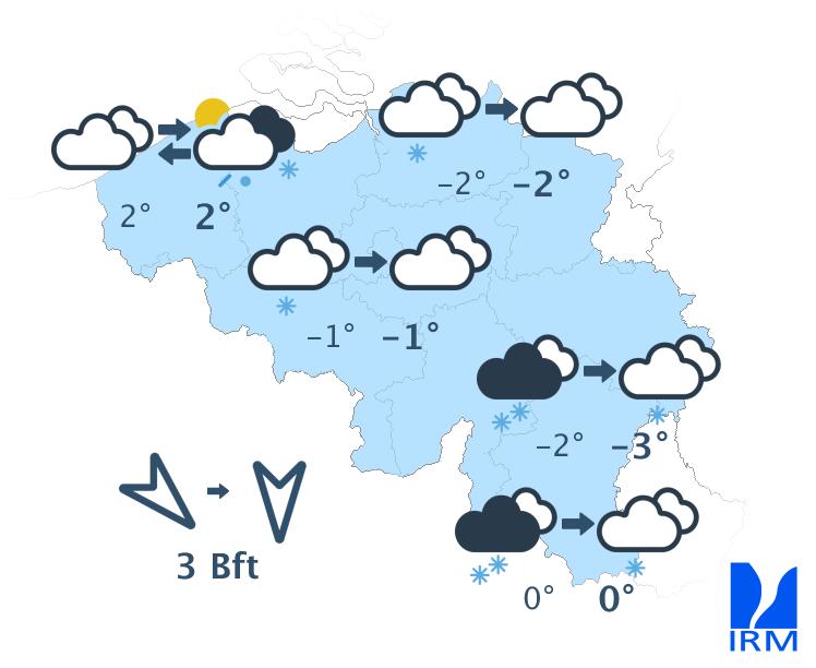 Samedi, le ciel restera très nuageux à couvert avec des précipitations qui pourront toujours être localement abondantes, surtout au sud du sillon Sambre et Meuse. Elles seront de neige sur la province de Limbourg, la botte du Hainaut et au sud du sillon Sambre et Meuse. Ailleurs, il s’agira davantage de neige fondante ou de pluie. Ensuite, les précipitations se transformeront progressivement en neige aussi sur le centre. Seul l'ouest/extrême ouest du pays devrait conserver de la pluie ou de la neige fondante. L'après-midi, le temps deviendra graduellement plus sec depuis le nord du pays. Les maxima seront atteints tôt dans la journée. Ils oscilleront entre -2 degrés dans les Hautes Fagnes et +4 degrés à la mer. En cours de la journée, les températures descendront de quelques degrés. Le vent sera modéré de nord à nord-ouest et en bord de mer il sera encore assez fort en premier lieu de nord-nord-ouest puis de nord.