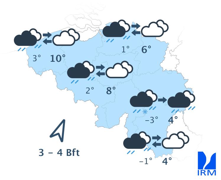 Ce soir et en première partie de nuit, le temps sera très nuageux à couvert avec de la pluie parfois abondante. En Haute Ardenne, nous attendons d'abord temporairement un peu de neige ou de neige fondante, mais la pluie prendra là aussi rapidement le relais. Quelques périodes transitoires plus sèches sont néanmoins prévues. Surtout en Ardenne, de mauvaises visibilités sont à craindre. Ailleurs, le temps deviendra plutôt brumeux. Le vent modéré de sud à sud-est se renforcera pour devenir assez fort à fort en s'orientant au sud-ouest. Les rafales atteindront 70 à 90 km/h (voire localement plus). Dans le nord du pays, les rafales devraient être moins intenses. Les minima atteindront en soirée 0 à 4 degrés puis les températures se radouciront dans la nuit.