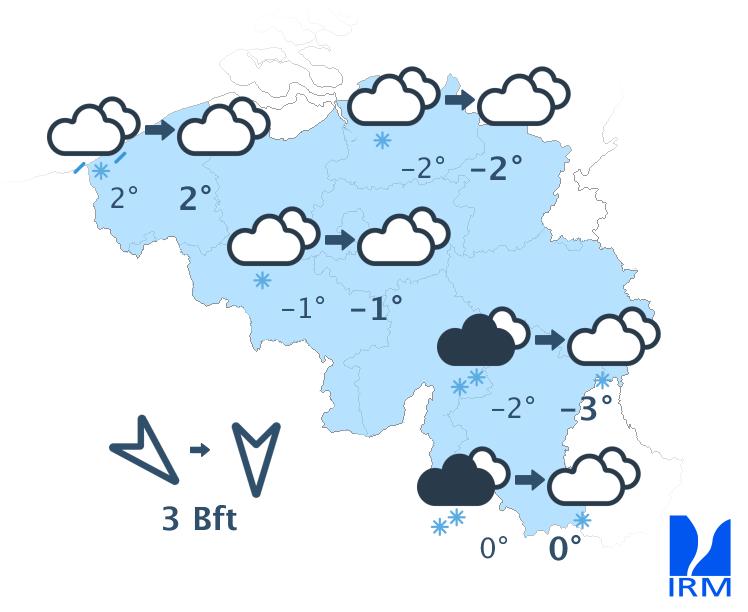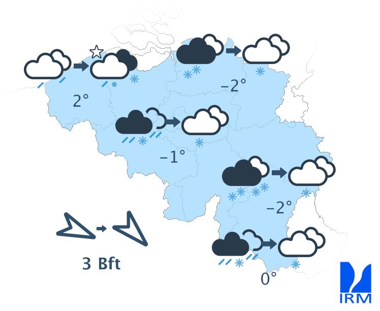 Vendredi soir et durant la nuit de vendredi à samedi, le ciel restera très nuageux à couvert avec des précipitations, parfois encore abondantes, surtout dans le sud et l'est du pays. Il s'agira de chutes de neige au sud du sillon Sambre et Meuse. Du centre à l'est, les précipitations adopteront aussi progressivement un caractère hivernal avec de la neige (fondante) jusqu'en Basse Belgique. Dans l'ouest, les précipitations resteront sous forme de pluie. Les minima seront de -3 degrés en Ardenne, autour de 0 ou +1 degré sur le centre, de +2 ou +3 dans l'ouest et jusqu'à +4 degrés à la mer. Le vent sera partout modéré, assez fort à la mer, d'ouest à nord-ouest.