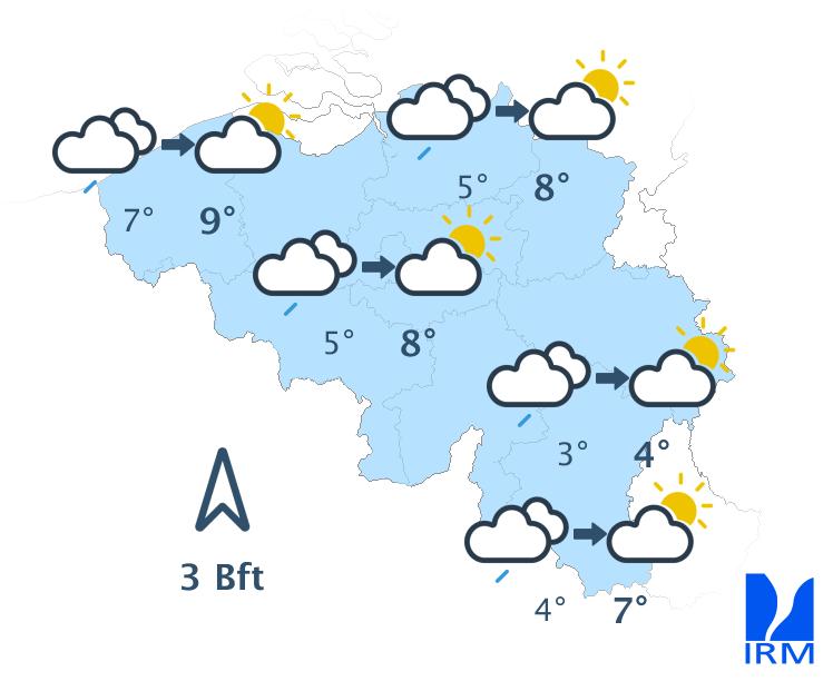 De mardi à jeudi, notre pays restera sous l'influence d'un flux océanique perturbé. Le ciel sera alors souvent très nuageux avec parfois quelques pluies, notamment mercredi. Sur les hauteurs de l'Ardenne, la visibilité sera généralement limitée. Les maxima se situeront autour de 4 degrés sur les reliefs de l'Est, et entre 7 et 9 degrés dans le centre du pays.