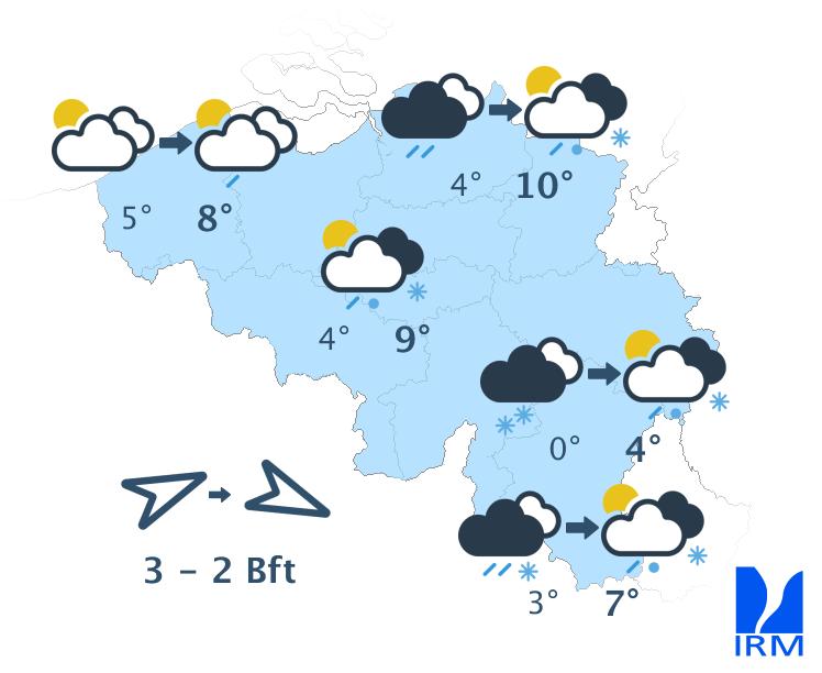 Le temps sera variable avec de fréquents passages pluvieux et quelques moments plus secs. Les températures remonteront entre 5 et 9 degrés.