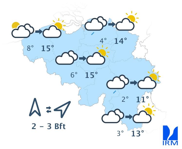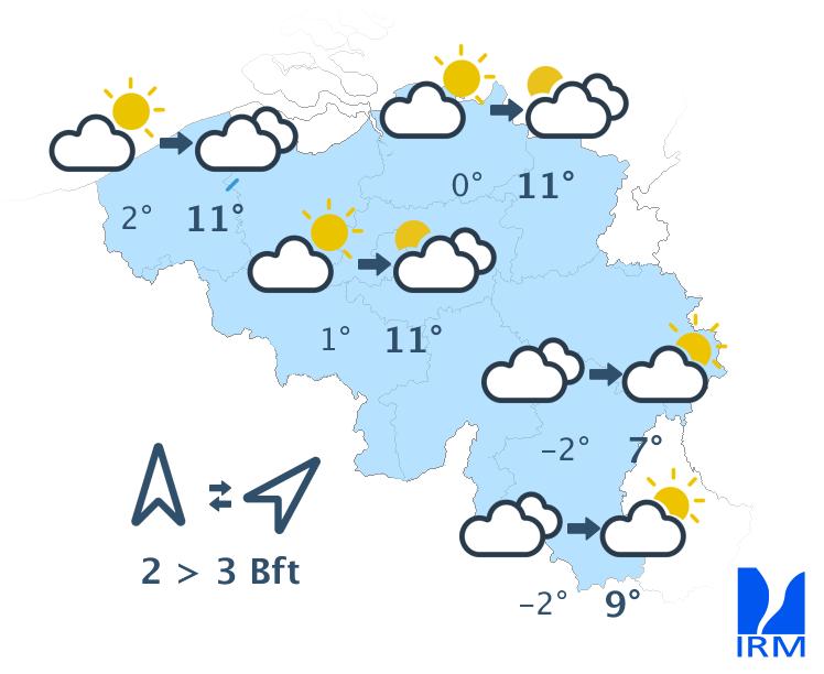 Cette nuit, quelques champs nuageux persisteront dans la région côtière. Ailleurs, le ciel sera souvent peu nuageux à étoilé. L'atmosphère deviendra brumeuse dans de nombreuses régions avec formation de quelques bancs de brouillard locaux. Des nuages bas seront également présents sur le versant sud-est de l'Ardenne avec du brouillard parfois dense et givrant. En cours de nuit, les nuages bas s'étendront graduellement vers l'ouest. Les minima seront compris entre -3 degrés dans certaines vallées de l'Ardenne et +3 degrés sur l'ouest du pays. Le vent sera faible à modéré de secteur sud-est.