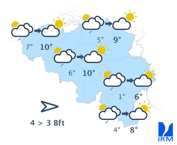 Demain, les brumes et bancs de brouillard locaux laisseront la place à un ciel partiellement nuageux et un temps sec. Les nuages bas et le brouillard pourront être plus tenaces sur le versant sud-est de l'Ardenne. Les maxima varieront entre 4 degrés sur les hauts plateaux de l'est et localement 10 degrés en Flandre et sur le centre du pays. Le vent sera faible à modéré de sud à sud-est.
