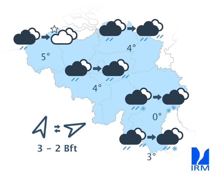 Mercredi, la nébulosité sera abondante avec de la pluie qui prendra ensuite la forme d'averses. Il fera assez doux avec des maxima de 7 degrés en haute Ardenne à 11 ou 12 degrés dans le centre du pays. Le vent sera modéré de sud-ouest, le long du littoral parfois assez fort avec des pointes de 50 km/h.