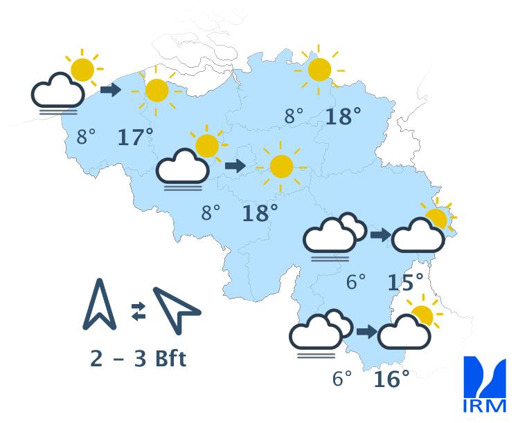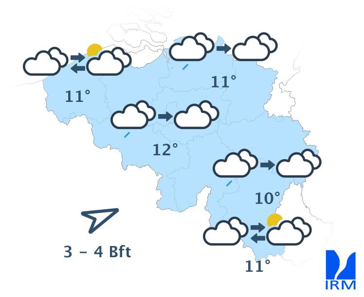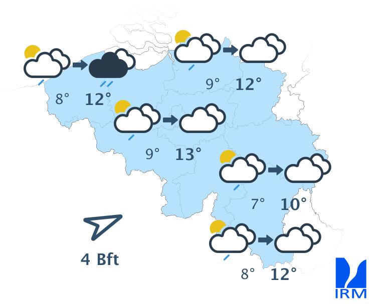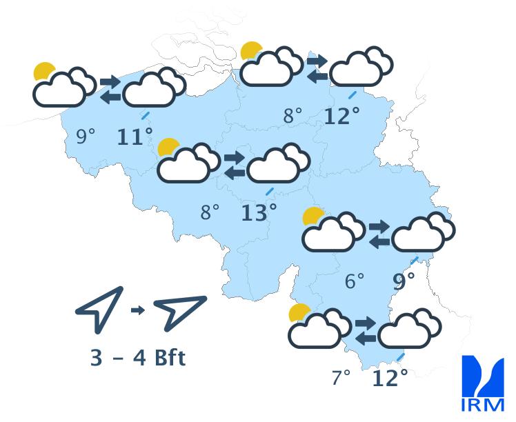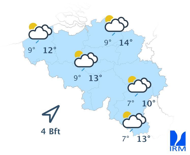 Il fera doux, avec des maxima entre 6 degrés dans les Hautes Fagnes et 12 ou 13 degrés dans le centre. Le vent de sud-ouest à ouest sera soutenu, généralement modéré dans l'intérieur et assez fort en bord de mer. Les rafales pourront atteindre 50 km/h.