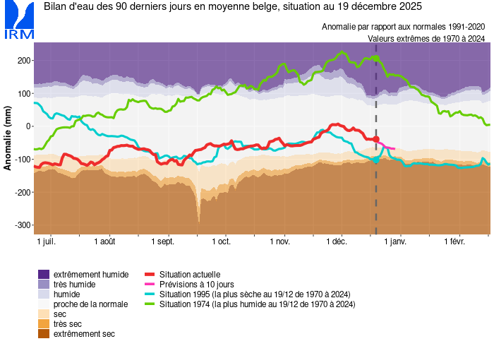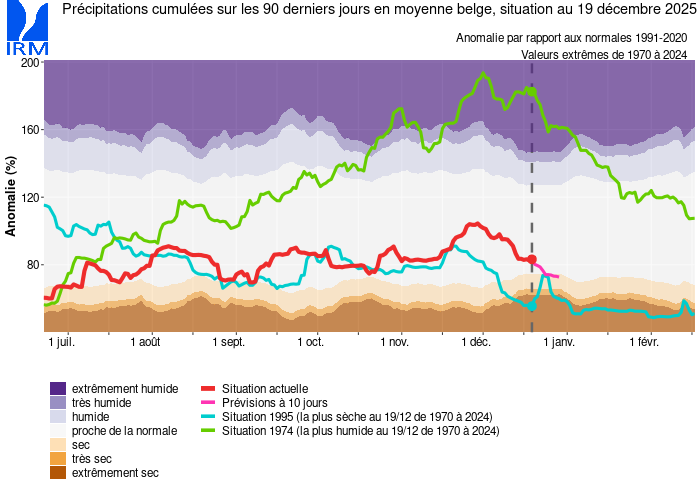 Le graphique ci-dessus montre l'évolution de la sécheresse éventuelle ou du surplus de précipitations dans le temps. La ligne rouge indique la position du total des précipitations (SPI-3) ou du bilan d'eau (SPEI-3) de ces 90 derniers jours par rapport aux valeurs climatologiques normales (rapport à la normale pour le SPI-3 et différence par rapport à la normale pour le SPEI-3). Il s'agit ici d'une moyenne pour toute la superficie du territoire belge. Les lignes verte et bleue indiquent respectivement l'évolution de la période de 90 jours la plus humide à la même date et l'évolution de la période de 90 jours la plus sèche à la même date.