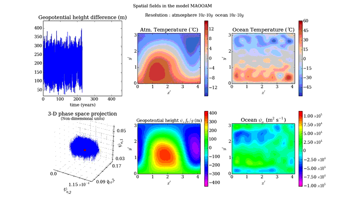 Cette animation montre l'évolution du modèle couplé océan/atmosphère MAOOAM pour une version de celui-ci contentant 620 variables, et couvrant un domaine de la taille de l'océan Atlantique. De gauche à droite, en haut : la différence d’altitude du géopotentiel à 500 hPa entre un point au nord et un autre au sud du domaine, la température atmosphérique et la température de l'océan. De gauche à droite, en bas : l’évolution de 3 variables via une projection 3-D de l’espace des phases du modèle, l’altitude du géopotentiel à 500hPa dans l’atmosphère et la fonction de courant de l’océan.