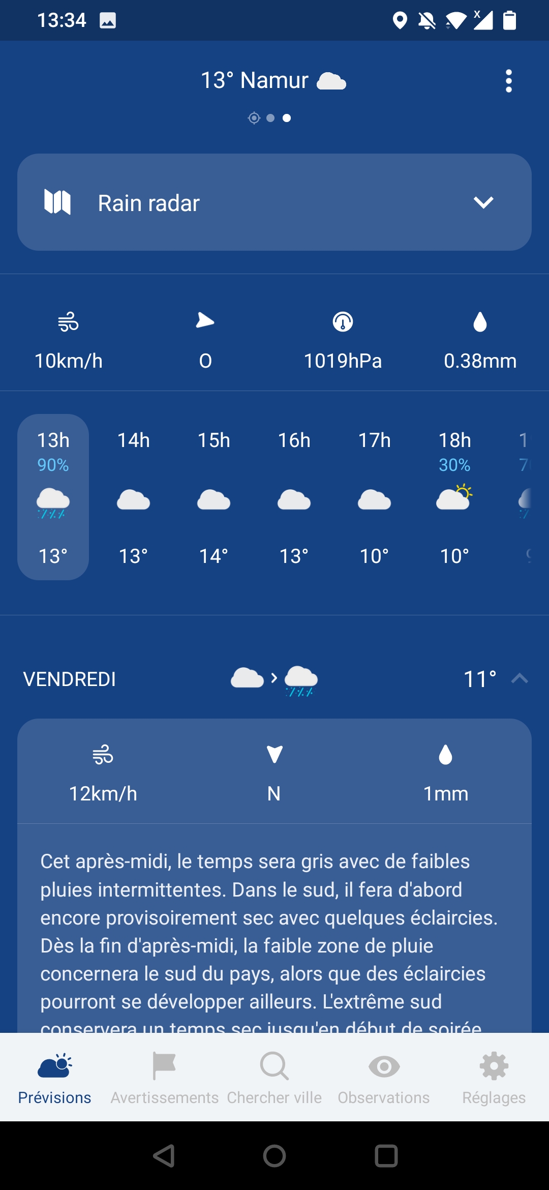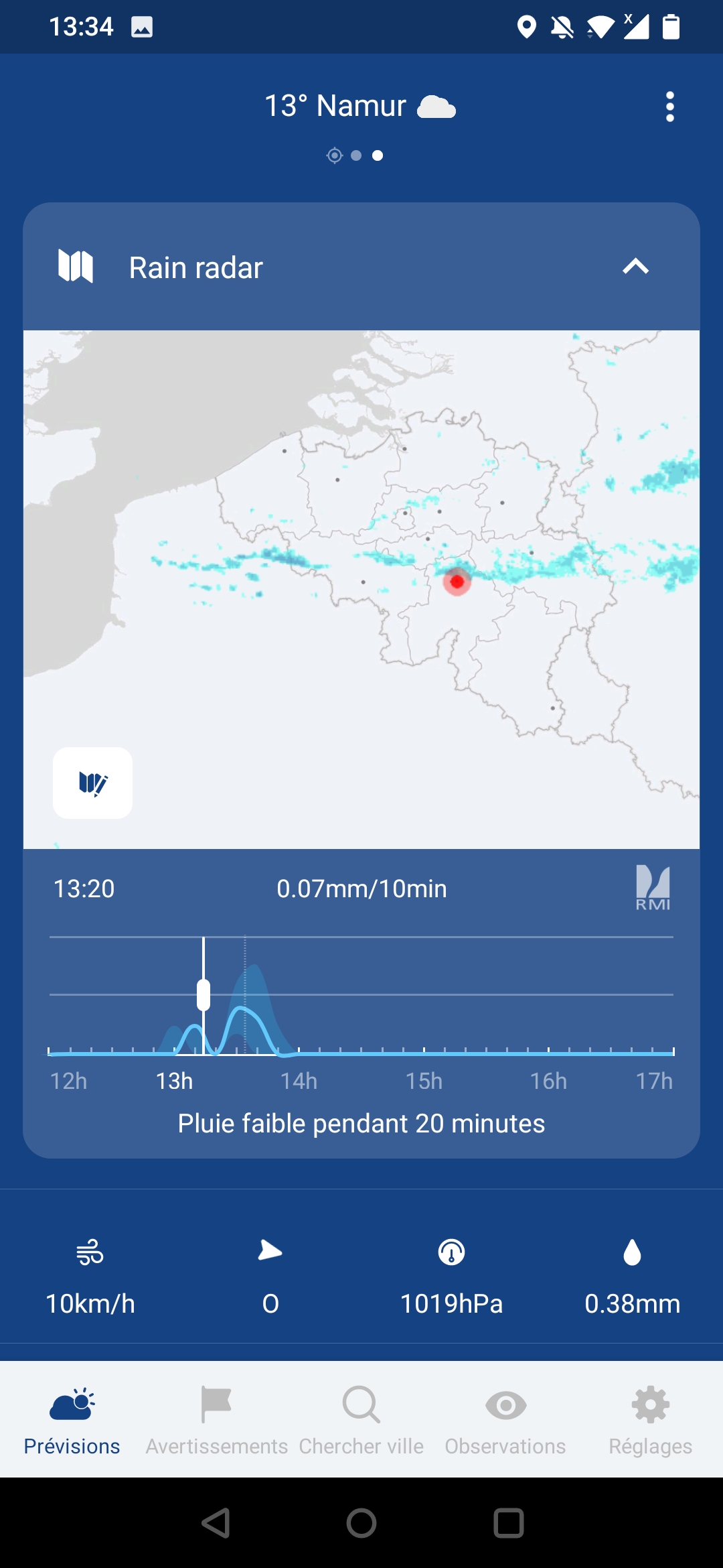 La nouvelle app de l'IRM fournit des prévisions horaires pour les 48 heures à venir, incluant les prévisions de température, de précipitations, de vent et de nébulosité tant pour votre emplacement que pour vos endroits favoris. En cliquant sur une heure précise, vous obtiendrez les prévisions de température, de vent et de précipitations pour l'heure choisie.