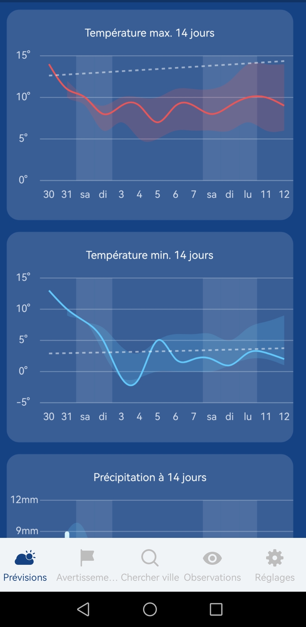 Enfin, pour Uccle nous fournissons également les tendances des températures diurnes et nocturnes et des précipitations jusqu'à 14 jours. Désormais, la météo n'aura plus de secret pour vous !