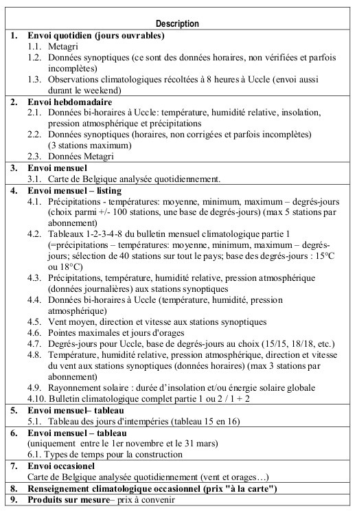 Le Service des Renseignements Météorologiques et Climatologiques vous propose différents produits standards disponibles sous forme d'abonnements.