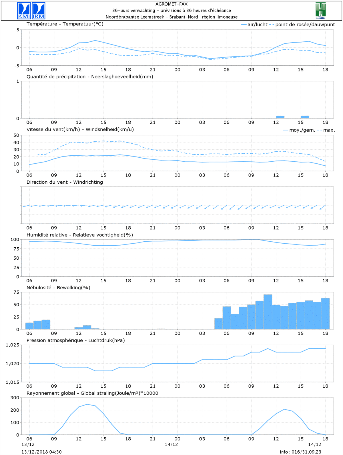 Indien u geabonneerd bent op de Agrometfax 36 uur, dan ontvangt u elke morgen omstreeks 7 uur een mail met de drie-uurlijkse verwachtingen, 36 uur ver, gebaseerd op de waarnemingen van middernacht. Zo beschikt u bij het krieken van de dag over de meest recente en nauwkeurige voorspellingen betreffende de lucht- en dauwpunttemperatuur, neerslaghoeveelheid, windsnelheid en maximale windsterkte, windrichting, relatieve vochtigheid, bewolking, globale straling en luchtdruk. Kortom, alle nodige meteorologische informatie om uw dag optimaal te kunnen plannen.