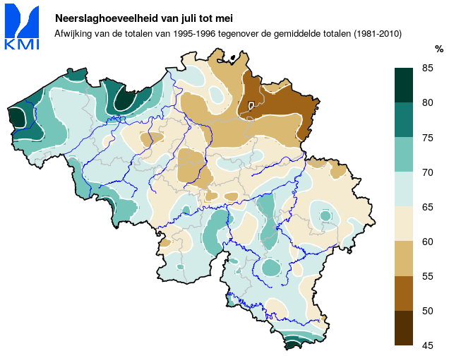Figuur 9 geeft de waargenomen neerslagtotalen voor het hele land weer vanaf juli 1995 tot en met mei 1996, uitgedrukt in procent van de normale totalen. Dit gebeurt op dezelfde manier als in figuur 4 voor de huidige droogte. De provincie Limburg werd het zwaarst getroffen door deze lange droogte, met lokaal neerslaghoeveelheden rond 50% van de normale waarde. Elders lagen de tekorten over het algemeen tussen 60% en 80% van de normalen.