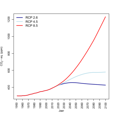 De globale uitstoot van broeikasgassen overschrijdt vandaag de dag zelfs het meest pessimistischeRCP 8.5-scenario. Op de laatste klimaattop in Parijs werd echter door 174 landen besloten dat de globale opwarming ruim onder de 2°C moet blijven. Om dit te bereiken, moet de wereldwijde CO2-uitstoot weldra verminderen.