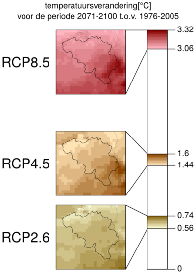 De impact van de klimaatverandering voor een bepaald scenario wordt berekend op basis van het verschil tussen een klimaatprojectie en de simulatie voor de historische periode. Zo tonen de onderstaande figuren het verschil in 2m-temperatuur tussen de periode 2071-2100 en 1976-2005, voor de drie scenario’s. In het meest optimistische RCP 2.6-scenario blijft de opwarming beperkt tot minder dan 1°C; daarentegen projecteert het meer pessimistisch RCP 8.5-scenario een opwarming van meer dan 3°C in België.