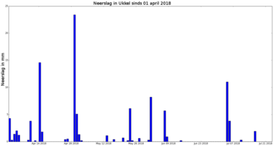 De neerslag in Ukkel – gemeten in ons automatisch station - sinds april is weergegeven in volgende figuur.