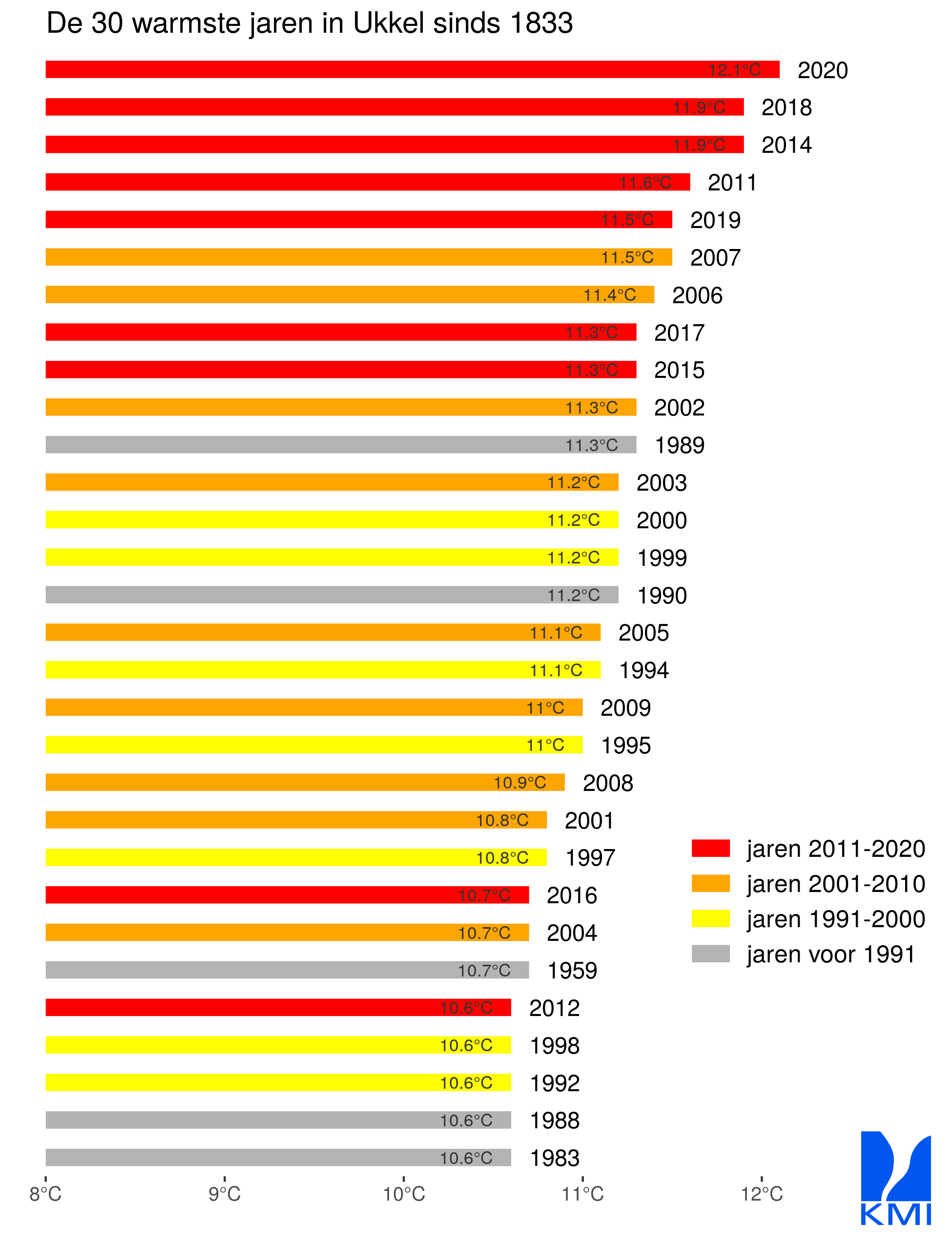 De figuur hieronder toont de 30 warmste jaren gemeten in Ukkel sinds 1833. Bij een gelijke gemiddelde jaarlijkse temperatuur tussen twee of meerdere jaren speelt er geen volgorde van belangrijkheid en wordt het meest recente jaar eerst weergegeven. Zoals zichtbaar op de figuur deden de 5 en 10 warmste jaren in Ukkel zich respectievelijk allemaal voor na 2010 en na 2000.
