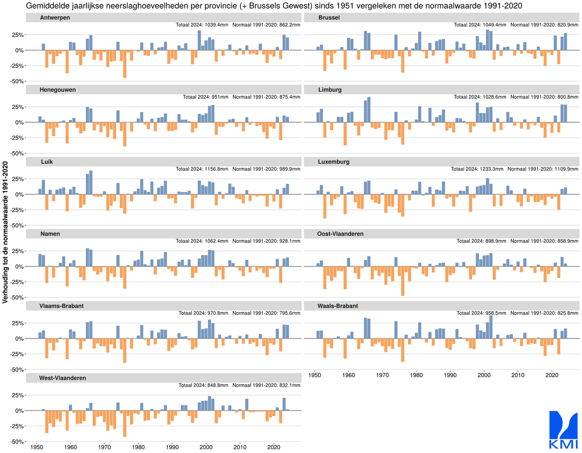 Fig. 3: Percentuele afwijking van de jaarlijkse neerslaghoeveelheden ten opzichte van de normale waarde weergegeven per provincie voor elk jaar tussen 1951 en 2024 (voor 2024 waarden t.e.m. 19 december 2024). De gemiddelde neerslagsom van 2024 en de normale waarde voor de huidige referentieperiode (1991-2020) zijn ook weergegeven per provincie.