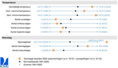 Op basis van de waarnemingen van Ukkel t.e.m. 19 december 2024 en de voorspellingen voor de rest van het jaar, ziet het er naar uit dat 2024 met een gemiddelde temperatuur van 11,9°C het zesde warmste jaar sinds het begin van de metingen in 1833 zal worden. De recordjaren blijven 2022 en 2020 met een gemiddelde temperatuur van 12,2°C. Met een verwachte gemiddelde minimumtemperatuur van 8,5°C eindigen we waarschijnlijk op een gedeelde tweede plaats (samen met 2014). Het record blijft hier staan op 2023 met 8,6°C.