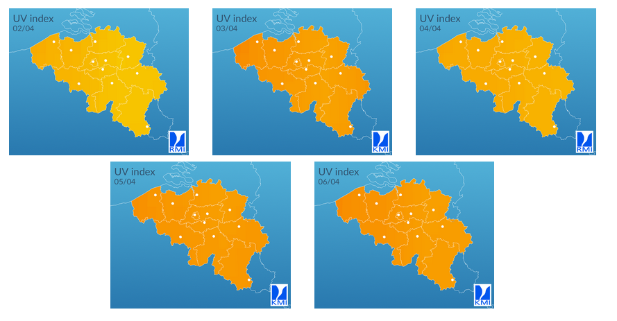 Door een samenwerking met het Deens Meteorologisch Instituut in het kader van de AC SAF van EUMETSAT zullen we voorspellingen voorzien van de uv-index bij onbewolkte hemel voor heel België (en dus niet alleen voor Ukkel zoals voordien het geval was). Kaarten met de voorspelde maximale uv-index voor België voor de komende 5 dagen, kunnen geraadpleegd worden via volgende link: