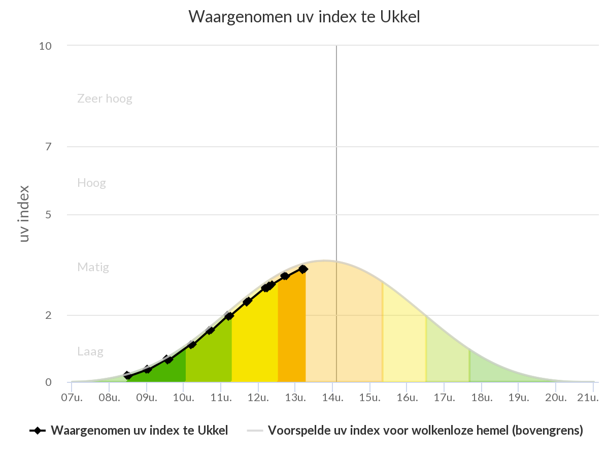 Tot slot kunnen jullie ook meevolgen welke uv-index effectief gemeten wordt op het dak van het KMI te Ukkel via volgende link: https://www.meteo.be/nl/weer/waarnemingen/uv-index