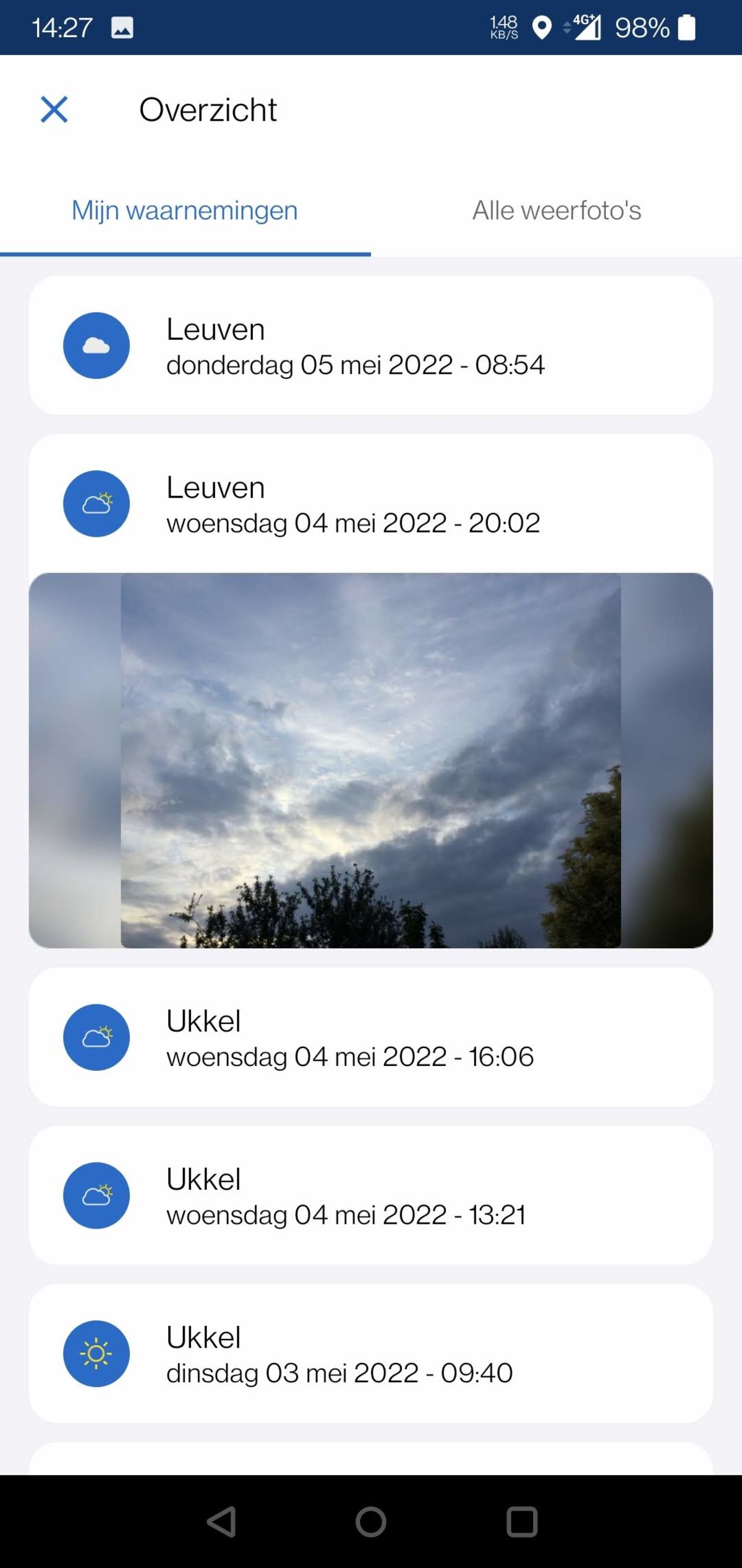 Gebruikers hadden al de mogelijkheid om een eigen weerwaarneming toe te voegen in de app. Deze functie wordt sterk gewaardeerd door onze gebruikers, en sinds de lancering ervan in augustus 2019 werden er al meer dan 2,1 miljoen observaties verzameld. Deze waarnemingen helpen ons dagelijks in onze operationele activiteiten: de voorspellers in onze weerkamer bekijken de gebruikerswaarnemingen intensief, en dit vooral bij potentieel gevaarlijke weerfenomenen zoals mist, onweer, hagel, sneeuw, enz... Daarnaast worden de waarnemingen ook gebruikt in verschillende wetenschappelijke studies, zoals de verificatie van de voorspellingen en waarschuwingen per gemeente, en studies die verband houden met neerslagtype.