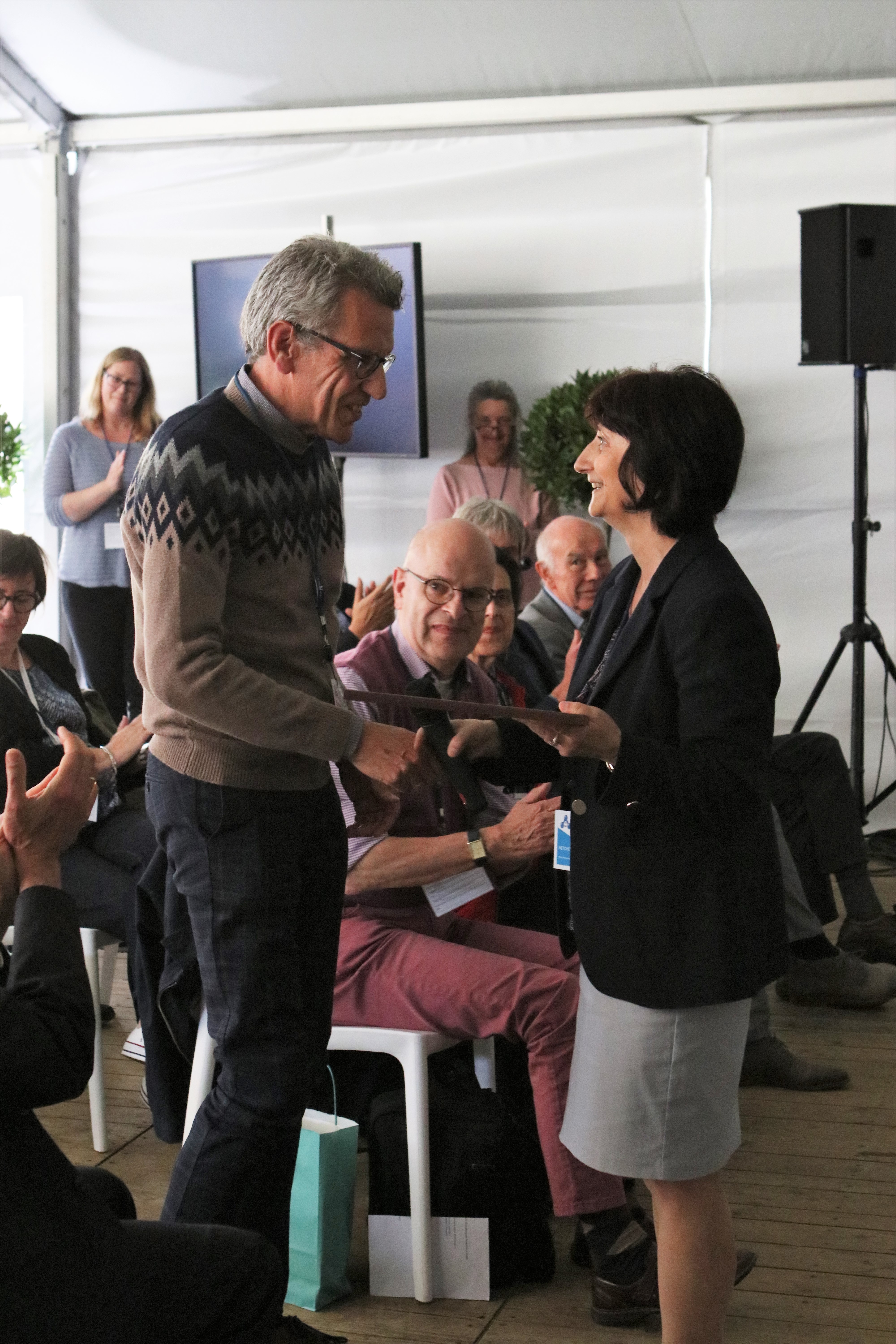 Uitreiking van het certificaat door Stoyka Netcheva van de WMO aan Hugo De Backer, hoofd van de Dienst Weerinstrumenten van het KMI.