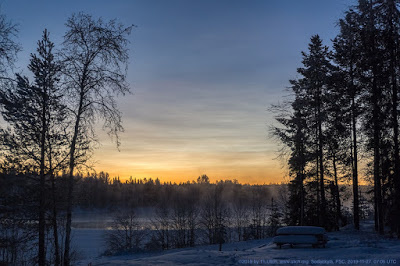 Figuur 1: Foto van parelmoerwolken boven Sodankylä (Lapland, Finland) op 27 november 2019 (getrokken door Thomas Ulich). Doordat de ijskristallen in dit type wolken zo klein zijn, levert de reflectie van het schemerlicht van de zon fraaie, regenboogkleurige, taferelen op.
