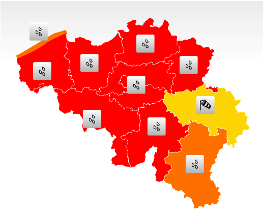 Oranje: Er wordt heel veel regen verwacht: veel of zeer intense buien ofwel zeer veel en langdurige neerslag op uitgebreide schaalof indien er al veel neerslag gevallen is in de vorige periodes. Dit kan aanleiding geven tot wateroverlast op verscheidene plaatsen in de regio of tot wateroverlast op uitgebreide schaal. Let dus bijzonder goed op.
