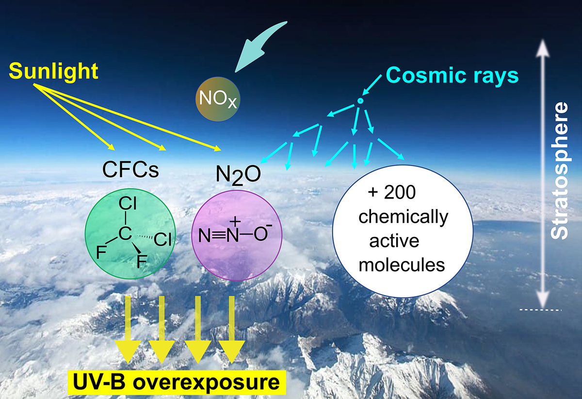 De toename van deze biologisch-actieve straling is het gevolg van de verhoogde atmosferische ionisatie door buitenaardse kosmische straling en uv-straling van de zon, versterkt door antropogene emissies. Zij kunnen de biosfeer op aarde aanzienlijk beïnvloeden door de aantasting van de ozonlaag.