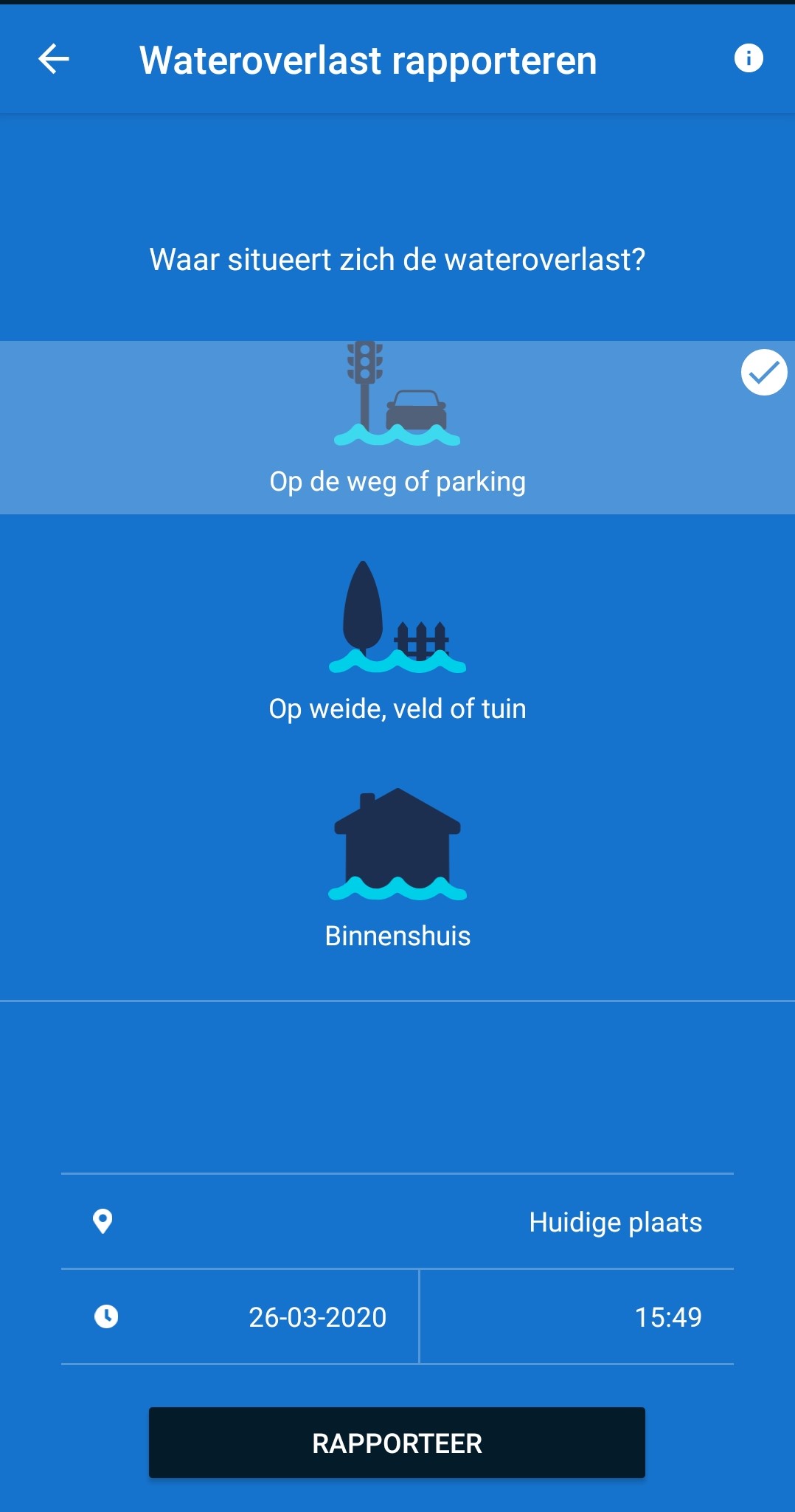 We dienen er wel op te wijzen dat een melding van een overstroming via onze app geen oproep vervangt voor interventies van de hulpdiensten of andere bevoegde autoriteiten. Dit dien je nog steeds te doen via de gebruikelijke kanalen.