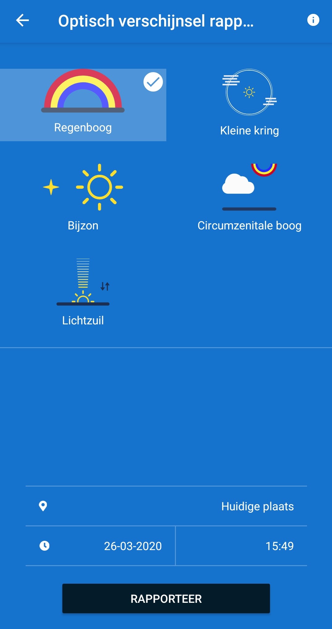 Een regenboog kent natuurlijk iedereen; over de andere verschijnselen hebben we een korte omschrijving in de app toegevoegd. Je vindt deze onder het info-knopje rechtsboven op het keuzescherm van de optische verschijnselen.