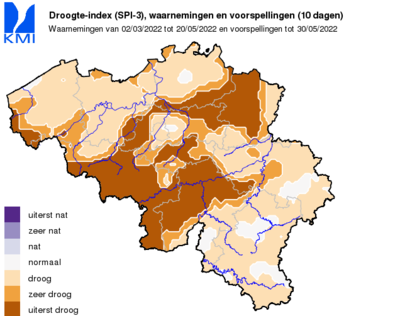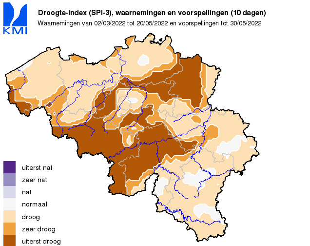 Voorbije lentemaanden waren droog, zelfs uiterst droog. Met 2,2 mm neerslag was de maand maart de droogste maand maart in Ukkel sinds het begin van de metingen in 1833. Zoals zichtbaar op de onderstaande figuur met de dagelijkse neerslag in Ukkel sinds 1 maart 2022, was de maand april iets natter (37,4 mm) en viel er tijdens het grootste deel van de maand mei geen neerslag (29,5 mm t.e.m. 19 mei, waarvan maar liefst 28,5 mm op 19 mei viel tijdens een onweer). Hiermee staat tot nu toe het neerslagtotaal voor de lente in Ukkel (1 maart t.e.m. 19 mei) op 69 mm, wat momenteel samen met 1976 het tweede laagste neerslagtotaal voor de lente is sinds het begin van de metingen en ruim onder de normaalwaarde van 165,6 mm ligt (voor de periode 1991-2020). Zelfs tijdens de recente droge lente van 2020 (105,7 mm) viel er meer neerslag in Ukkel.