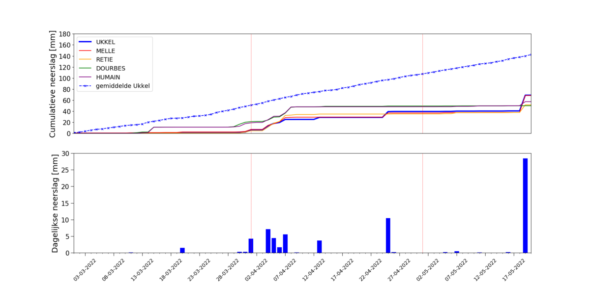 Bovenaan: Cumulatieve neerslag voor Ukkel, Melle, Retie, Dourbes en Humain. Onderaan: Dagelijkse neerslag in Ukkel voor de periode van 1 maart tot en met 19 mei 2022.