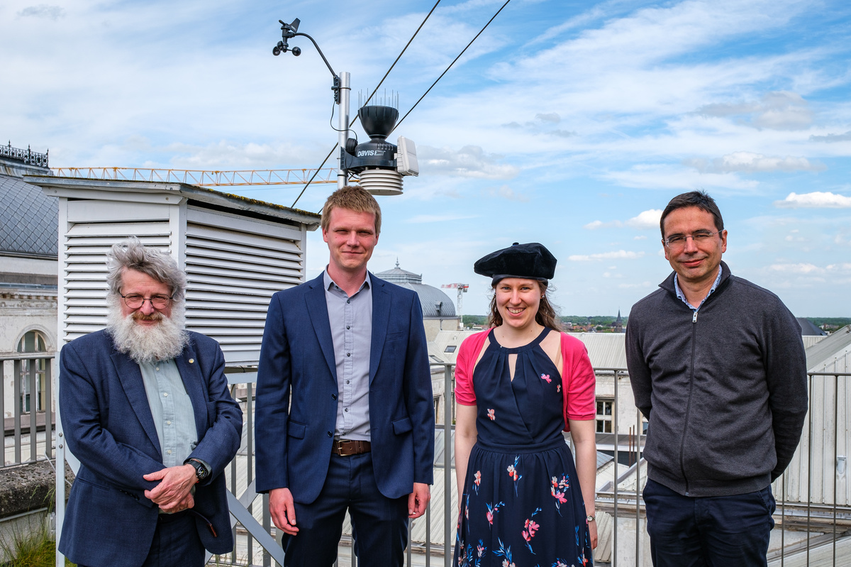 Sara Top samen met haar promotoren van haar doctoraatsonderzoek (van links naar rechts): Em. prof. dr. Philippe De Maeyer, prof. dr. ir. Steven Caluwaerts, prof. dr. Piet Termonia.