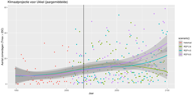 Projectie: De gekleurde punten tonen het jaarlijks aantal zomerdagen. De gekleurde lijnen tonen de evolutie van het aantal zomerdagen tot het eind van deze eeuw.