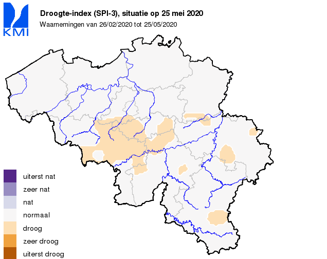 De lage relatieve luchtvochtigheid en de uitbundige zonneschijn resulteerden in relatief veel verdamping. Waar de cumulatieve neerslag van de voorbije drie maanden in vele streken nog dicht bij de normaal ligt (weergegeven met de Standardized Precipitation Index, SPI-3, onderstaande figuur links), zien we relatief veel gebieden waar de droogte nu reeds ernstig of zeer ernstig is wanneer we ook naar de verdamping kijken (de Standardized Precipitation-Evapotranspiration Index, SPEI-3, onderstaande figuur rechts).