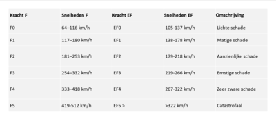 Tabel: Overzicht met een vergelijking tussen de oude (F-schaal) en de nieuwe, verbeterde schaal (EF-schaal).