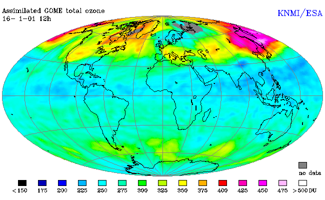 Hieronder wordt een globaal beeld gegeven van de ozonlaag: de kleuren staan voor de dikte van de ozonlaag. De blauwe kleuren duiden op gebieden met een dunne ozonlaag, terwijl rood en purper een dikkere ozonlaag voorstellen. Het is duidelijk dat de ozonlaag dunner is bij de evenaar dan aan de Noordpool.