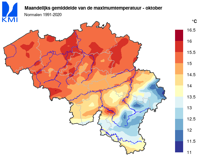 De jaarlijkse normalen van de gemiddelde luchttemperatuur in België schommelen tussen 7,5°C op de Hoge Venen en sommige Ardense toppen en 11,4°C in de Kempen. De gemiddelde Belgische temperatuur bedraagt 10,2°C. Met een voor België gemiddelde temperatuur van 18,1°C is juli de warmste maand terwijl januari de koudste is met gemiddeld 3°C. De jaarlijkse normalen van de dagelijkse maximum- en minimumtemperaturen schommelen respectievelijk tussen 11°C en 15,9°C en tussen 3°C en 7,7°C. Deze normalen bereiken stelselmatig hun laagste waarden op de Hoge Venen terwijl de locatie van de maxima wisselt in de loop van het jaar. Wanneer men naar het hele Belgische grondgebied kijkt, vertonen al deze normalen variaties in de grootteorde van 4°C, onafhankelijk van de maand of het seizoen. Hun verdeling wordt hoofdzakelijk bepaald door twee factoren : de afstand tot de zee en de hoogteligging.