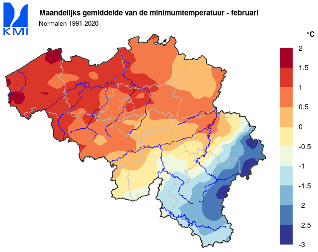 De jaarlijkse normalen van de gemiddelde luchttemperatuur in België schommelen tussen 7,5°C op de Hoge Venen en sommige Ardense toppen en 11,4°C in de Kempen. De gemiddelde Belgische temperatuur bedraagt 10,2°C. Met een voor België gemiddelde temperatuur van 18,1°C is juli de warmste maand terwijl januari de koudste is met gemiddeld 3°C. De jaarlijkse normalen van de dagelijkse maximum- en minimumtemperaturen schommelen respectievelijk tussen 11°C en 15,9°C en tussen 3°C en 7,7°C. Deze normalen bereiken stelselmatig hun laagste waarden op de Hoge Venen terwijl de locatie van de maxima wisselt in de loop van het jaar. Wanneer men naar het hele Belgische grondgebied kijkt, vertonen al deze normalen variaties in de grootteorde van 4°C, onafhankelijk van de maand of het seizoen. Hun verdeling wordt hoofdzakelijk bepaald door twee factoren : de afstand tot de zee en de hoogteligging.