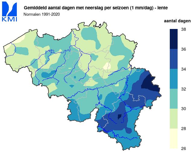 Gemiddeld genomen telt België 142 dagen met minstens 1 mm neerslag en 26 dagen met minstens 10 mm neerslag. December kent gemiddeld gezien het hoogste aantal neerslagdagen. De ruimtelijke verdeling van deze kaarten is vergelijkbaar met deze van de neerslaghoeveelheden : een relatief uniforme verdeling in Laag- en Midden-België, omvangrijke gradiënten in Hoog-België en lokale maxima op de Hoge Venen, op sommige toppen in de Ardennen en in de streek van Libramont-Carlsbourg-Bouillon. Wanneer we de grens van 1 mm nemen, situeert het jaarlijkse maximum zich in de Hoge Venen terwijl dit maximum zich in de streek van Libramont-Carlsbourg-Bouillon bevindt bij de grens van 10 mm. Dit verklaart de verschillende neerslagregimes in deze twee streken.
