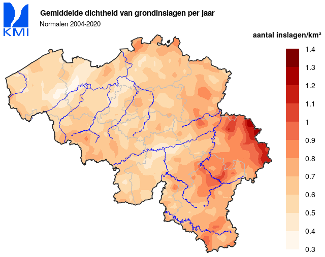 Wanneer we kijken naar de ruimtelijke verdeling van het gemiddeld aantal grondinslagen per jaar in België, dan zien we dat deze varieert tussen 0.3 inslagen/km² in het westen en verhoogt tot 1.4 inslagen/km² naar het oosten toe. De gemiddelde waarde bedraagt ongeveer 0.7 inslagen/km². De ruimtelijke verdeling volgt in zekere mate de topografie van België, waarbij de hoogste waarden worden waargenomen in gebieden op grotere hoogte. Dit is niet zo verwonderlijk aangezien hoogteverschillen in het landschap de ontwikkeling van donderwolken beïnvloeden.