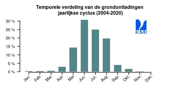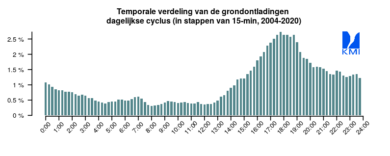 Als we kijken naar het verloop van de bliksemintensiteit per maand, dan vinden we dat 90% van alle bliksemactiviteit in België wordt waargenomen tussen mei en augustus, met een piek in juni en juli. Daarentegen wordt tijdens de wintermaanden het minst aantal bliksemontladingen waargenomen. Hetzelfde kunnen we doen, maar dan voor het tijdsverloop in activiteit op een dag. We zien dan dat de hoogste bliksemactiviteit wordt waargenomen in de namiddag rond 17:00 uur lokale tijd, en dat de activiteit daalt naar de avond en ochtend toe.