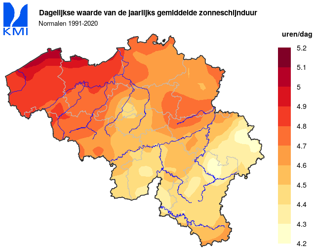 Wanneer we naar het jaarlijkse gemiddelde kijken, varieert de dagelijkse gemiddelde zonneschijnduur tussen 4.2 uur zon op de Hoge Venen en bijna 5.2 uur aan de Kust. Deze ruimtelijke verdelingen zijn sterk verbonden met de gemiddelde bewolkingsgraad. De omvangrijke variaties gedurende het jaar over het land (van gemiddeld 1.6 uur in december tot 7.1 uur in de zomer) zijn het gevolg van de evolutie van de periode tussen zonsopkomst en –ondergang.